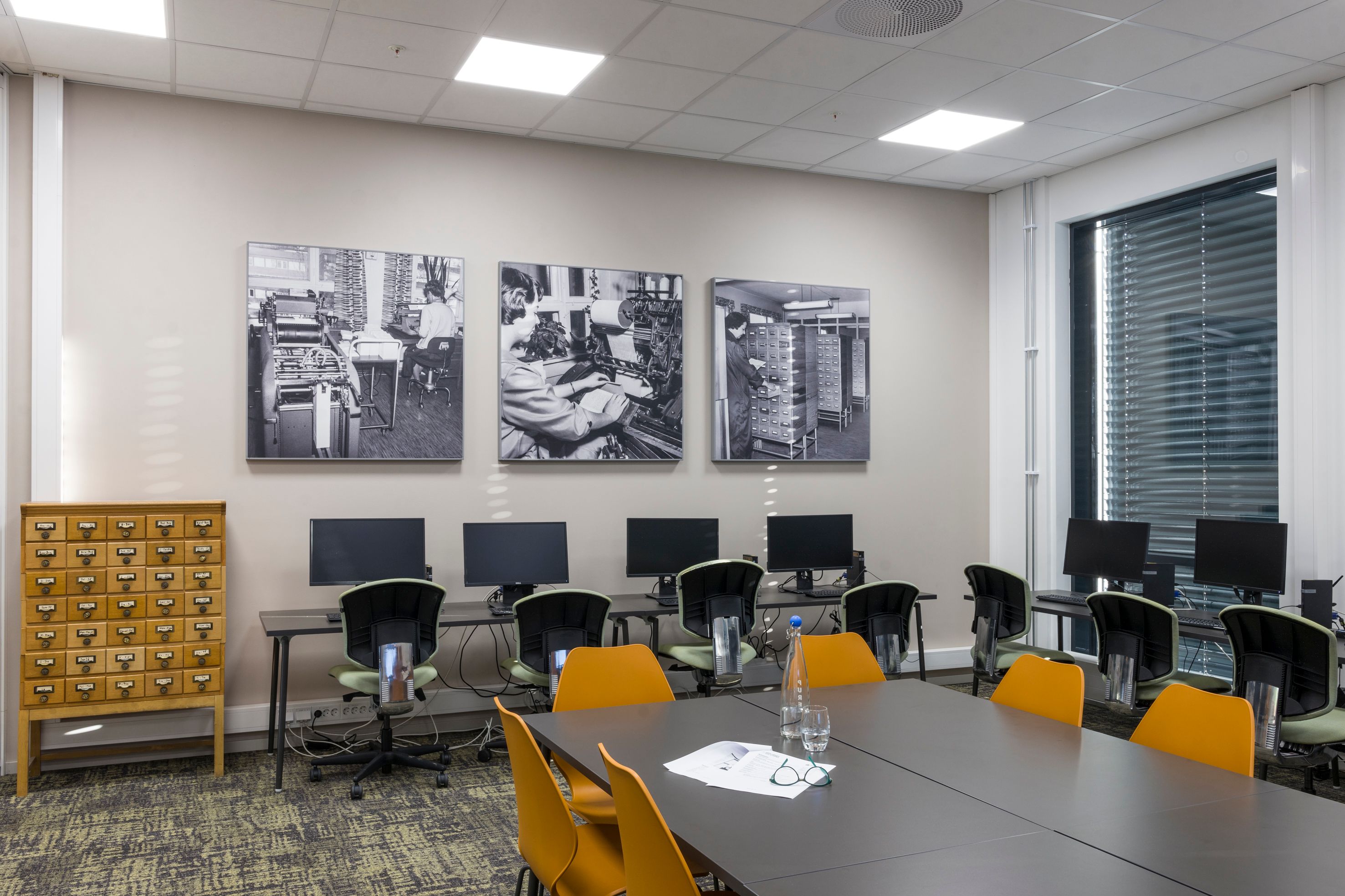 Vi har også et kursrom og et auditorium, og de har fått navn etter rom som fantes i Bibliotekenes Hus for mange år siden: Kort`n og Bokbinderiet. I Kort`n er det laget akustiske plater av gamle bilder fra huset. I Bokbinderiet kan man finne et gammelt glassmaleri som er funnet på loftet i vårt gamle hus. Det viser bokbinderkunsten. Vi har fått det pusset opp, og nå henger det fint på veggen i auditoriet i vårt nye hus.