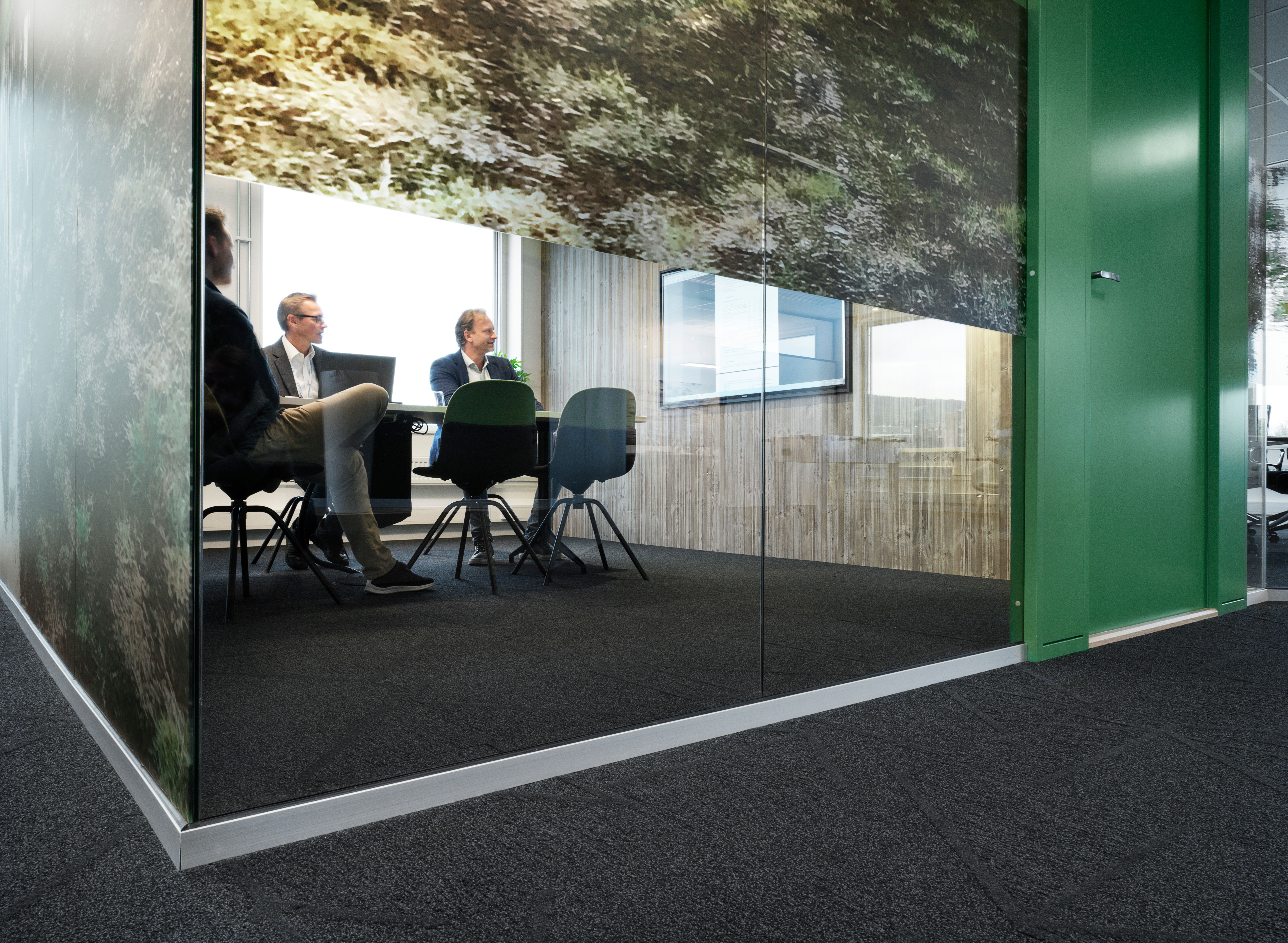 Lyse, luftige, gjennomgående og åpne arenaer gjør det mulig å møtes til kaffe, uformelle samtaler og til og med til en liten fotballturnering. Naturens egne elementer er brukt gjennomgående, helt til designen i folieringen, og lokalene fremstår grønne, lune og harmoniske.