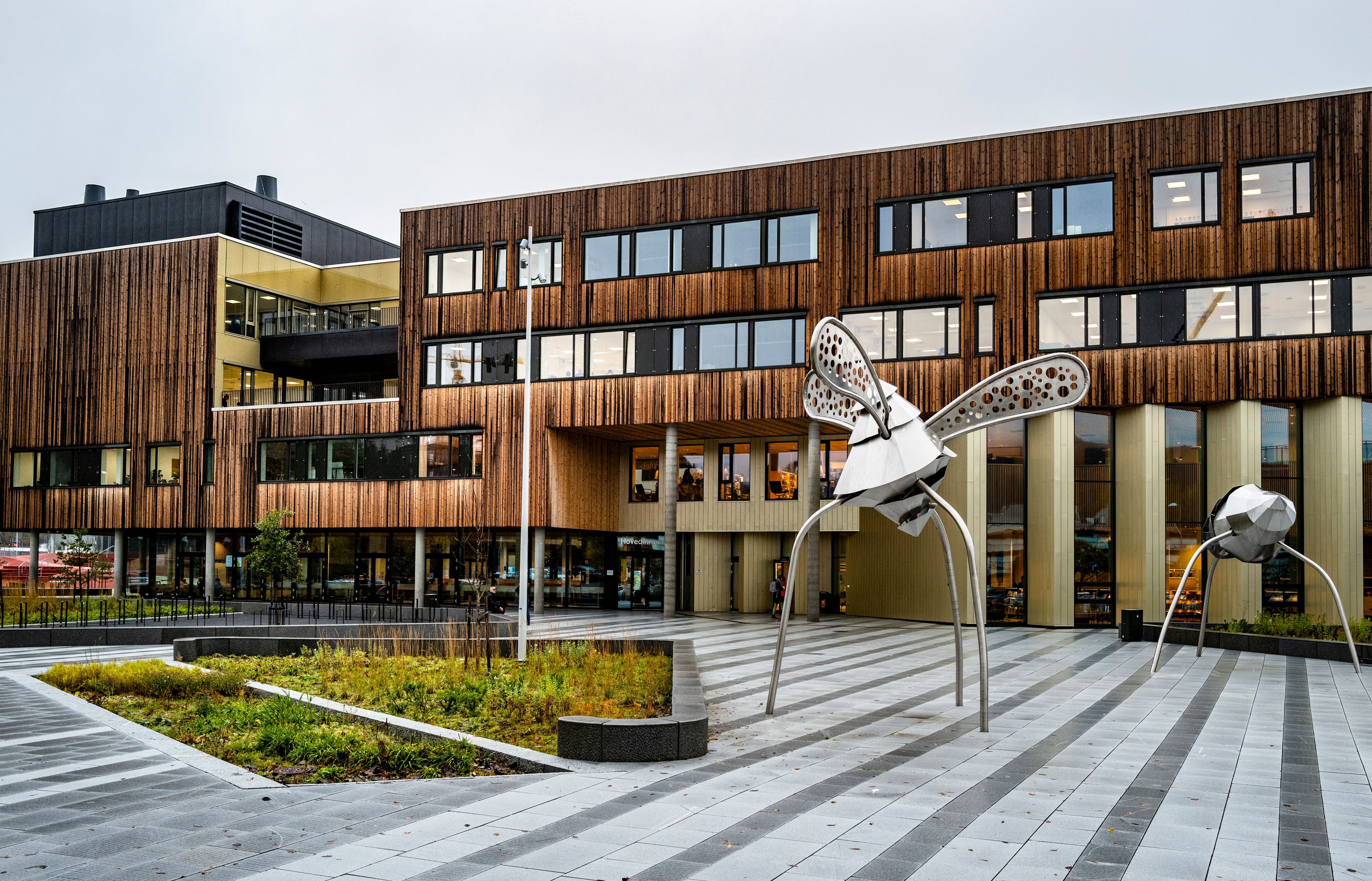 Fasadene er kledd med termofuru og mørk tegl. Ved byggets tre innganger og i deler av første etasje, er det glassfasader. Gulleloksert aluminium skal fremheve hovedinngang, bibliotek og kulturhuset. Bygget er et passivhus med BREEAM Excellent klassifisering.
