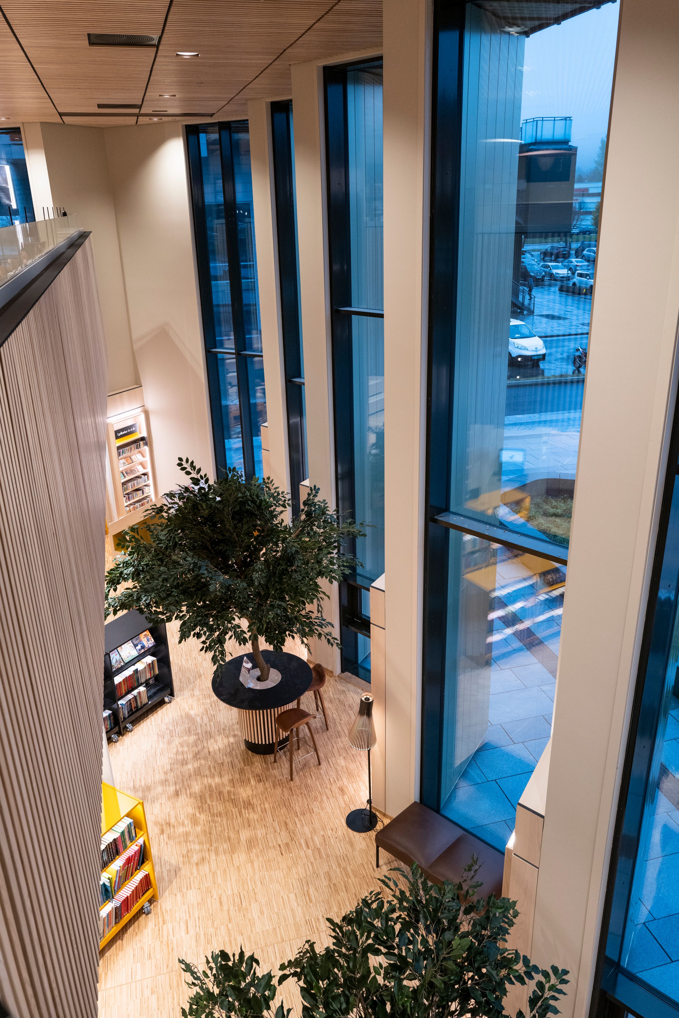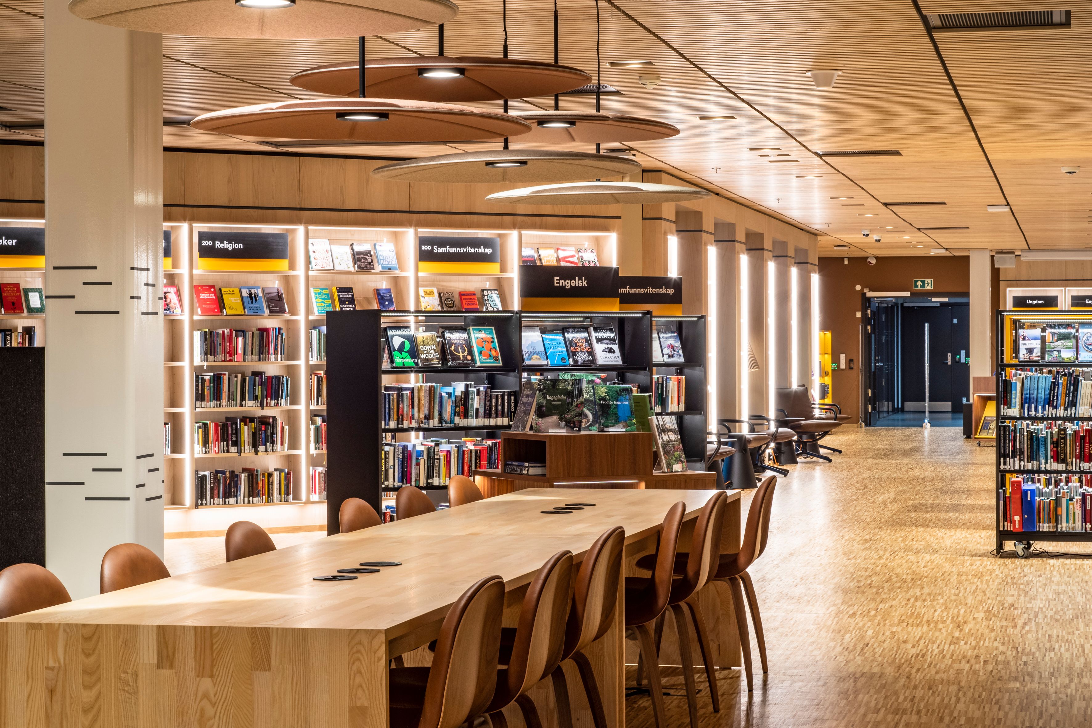 Biblioteket har mange sitteplasser, både individuelle og for gruppearbeid. Lampene over langbordet i eik, heter Lily og er lydabsorberende.