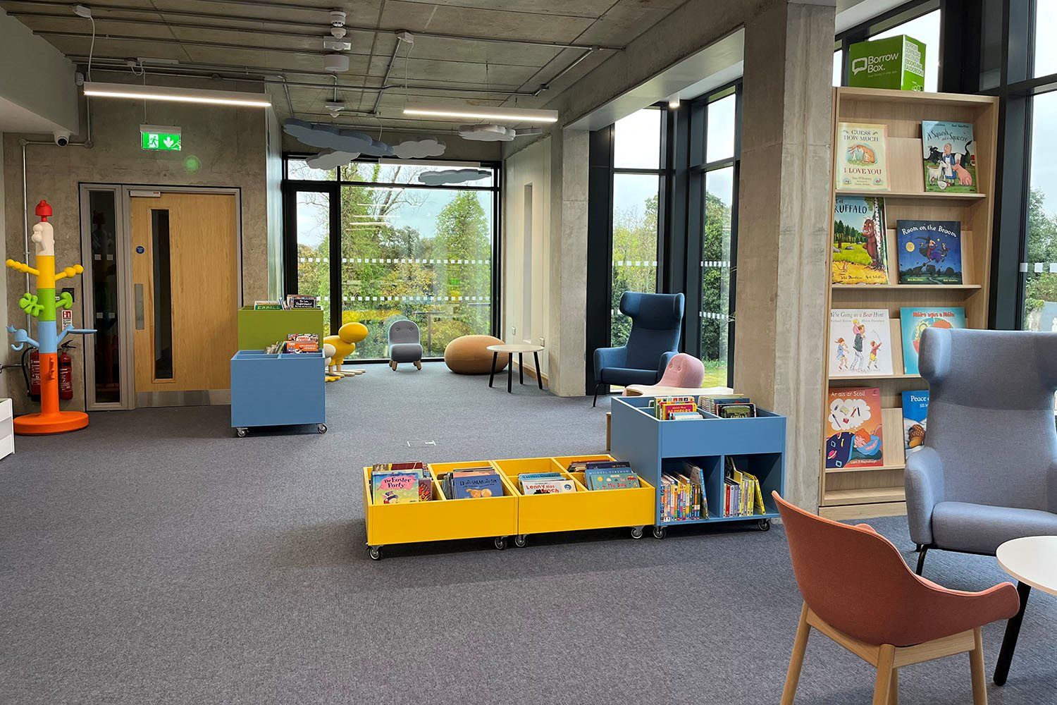 Biofil bibliotekdesign kommer meget godt til uttrykk her med mye naturlig lys, heldekkende fototapet og naturinspirerte møbler. Organisk formede møbler som Havana lenestol, Puzzle barnebord med krakker, barnestolen Bob, puff Cut og stilistiske lekefugler Happy Bird gir mykhet og varme til rommet. I tillegg forsterker den gressgrønne bildebokkassen Sara på hjul følelsen av å trekke naturen helt inn i barneavdelingen.
