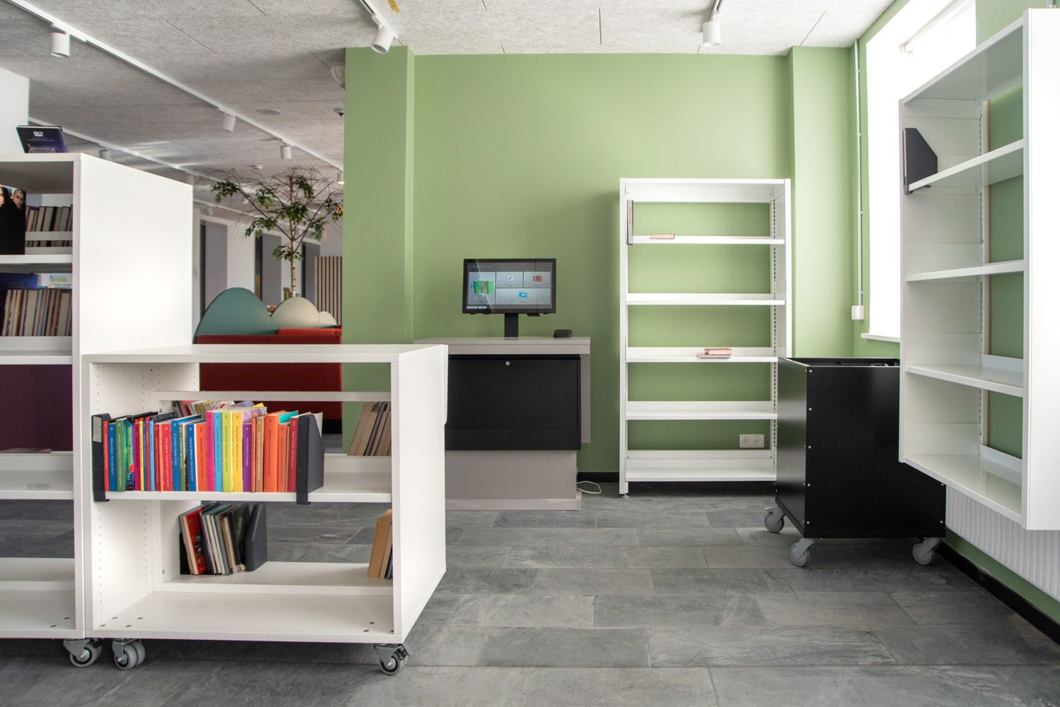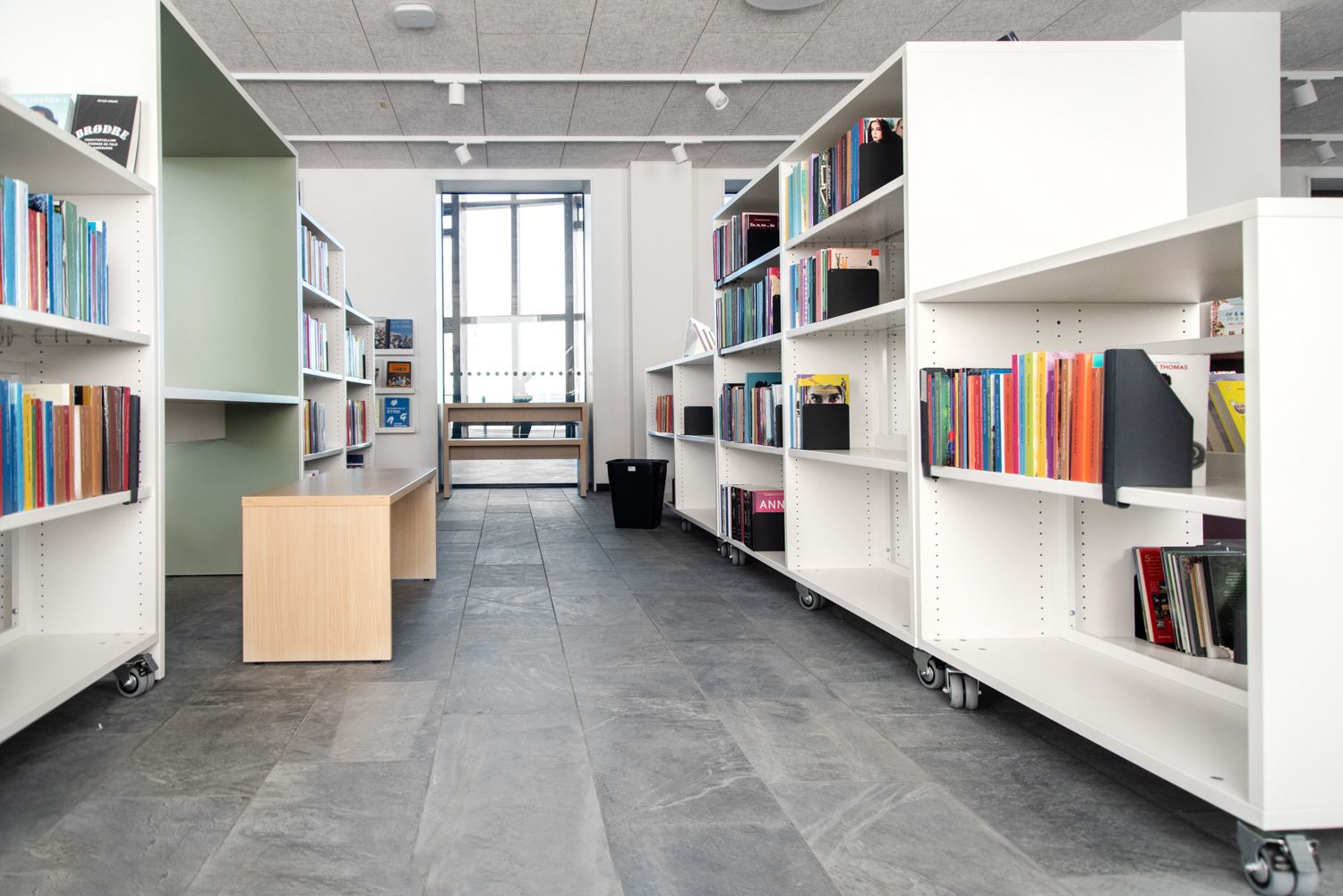 Mange av de doble reolene har hjul, noe som gir stor fleksibilitet i bruk av lokalet.