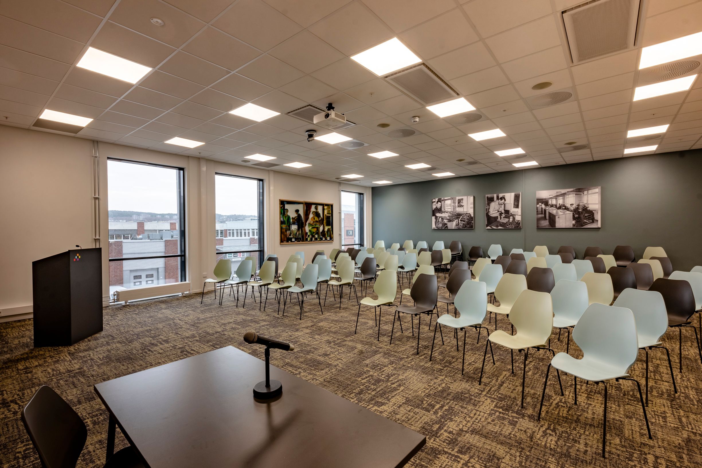 Vi har også et kursrom og et auditorium, og de har fått navn etter rom som fantes i Bibliotekenes Hus for mange år siden: Kort`n og Bokbinderiet. I Kort`n er det laget akustiske plater av gamle bilder fra huset. I Bokbinderiet kan man finne et gammelt glassmaleri som er funnet på loftet i vårt gamle hus. Det viser bokbinderkunsten. Vi har fått det pusset opp, og nå henger det fint på veggen i auditoriet i vårt nye hus.