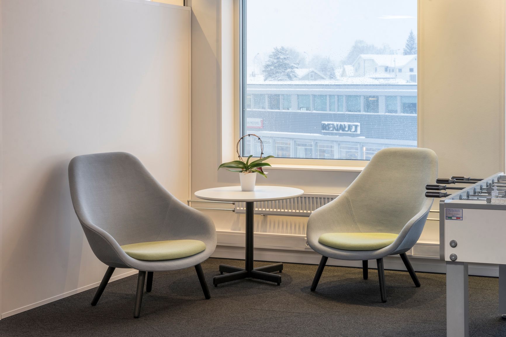 Lyse, luftige, gjennomgående og åpne arenaer gjør det mulig å møtes til kaffe, uformelle samtaler og til og med til en liten fotballturnering. Naturens egne elementer er brukt gjennomgående, helt til designen i folieringen, og lokalene fremstår grønne, lune og harmoniske.