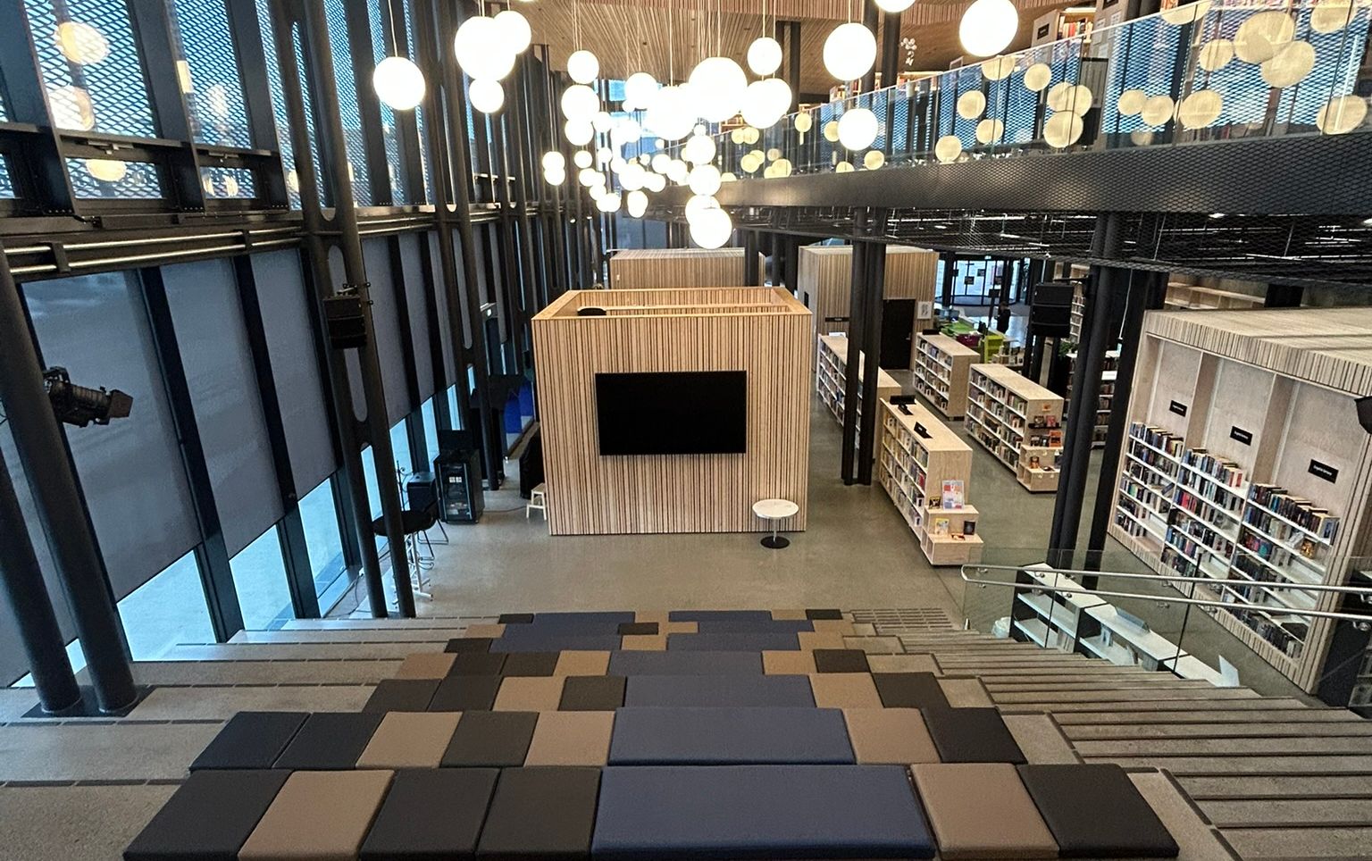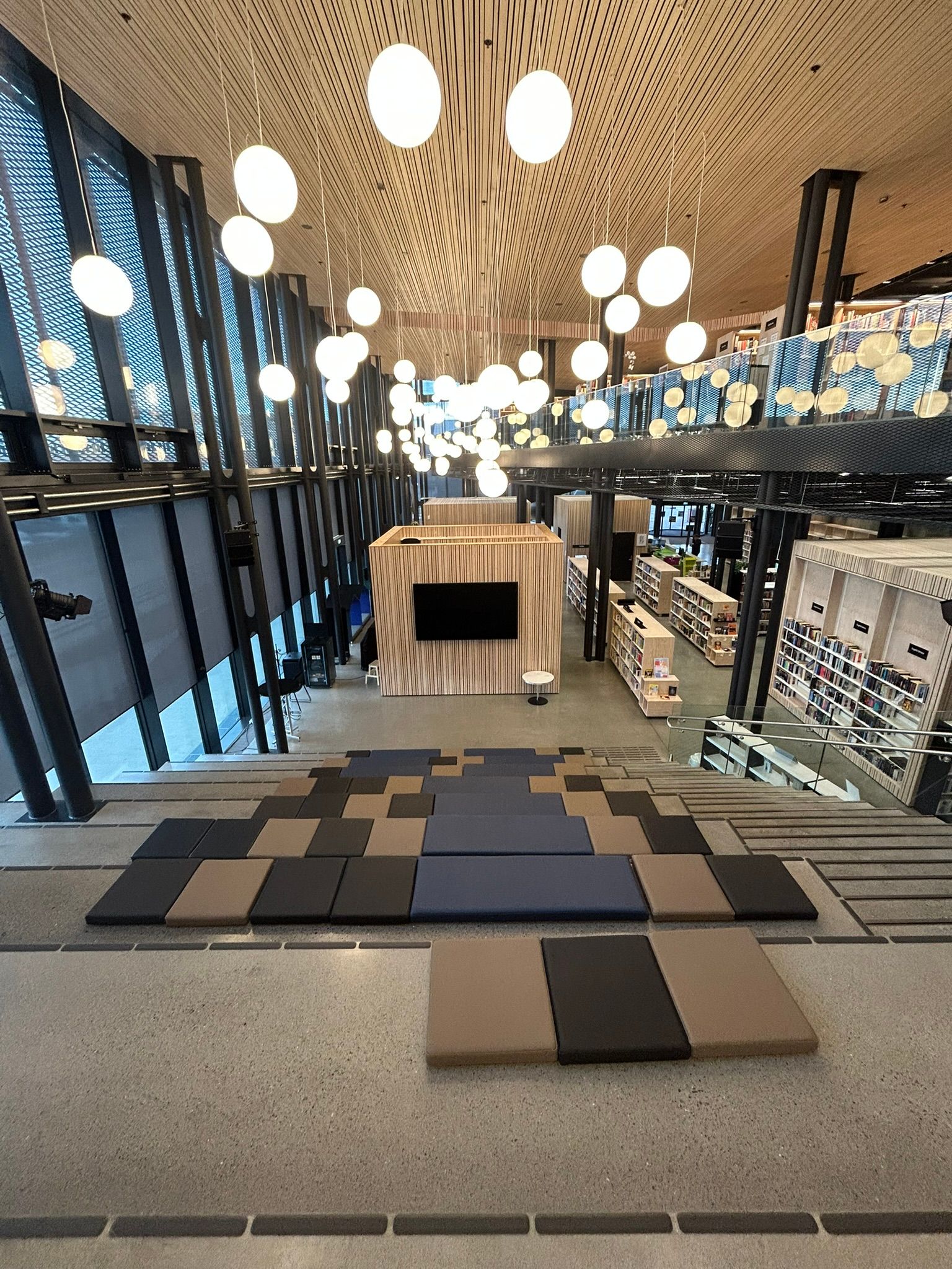 Amfitrappen er et sentralt arkitektonisk element i biblioteket, og fungerer både som kommunikasjon mellom etasjene og som en fleksibel møte- og arrangementsarena. Trappen er utformet som et åpent sitteamfi med brede trinn som inviterer til opphold, lesing og uformelle møter i hverdagen. De dype trinnene har vi utstyrt med løse sitteputer i ulike bredder og farger for ekstra god sittekomfort.