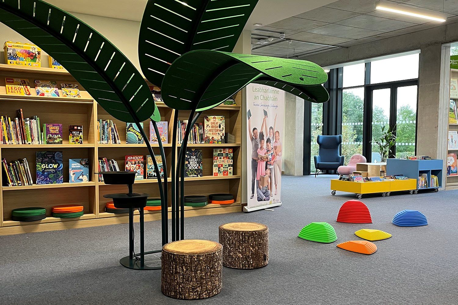 Biofil bibliotekdesign kommer meget godt til uttrykk her med mye naturlig lys, heldekkende fototapet og naturinspirerte møbler. Organisk formede møbler som Havana lenestol, Puzzle barnebord med krakker, barnestolen Bob, puff Cut og stilistiske lekefugler Happy Bird gir mykhet og varme til rommet. I tillegg forsterker den gressgrønne bildebokkassen Sara på hjul følelsen av å trekke naturen helt inn i barneavdelingen.