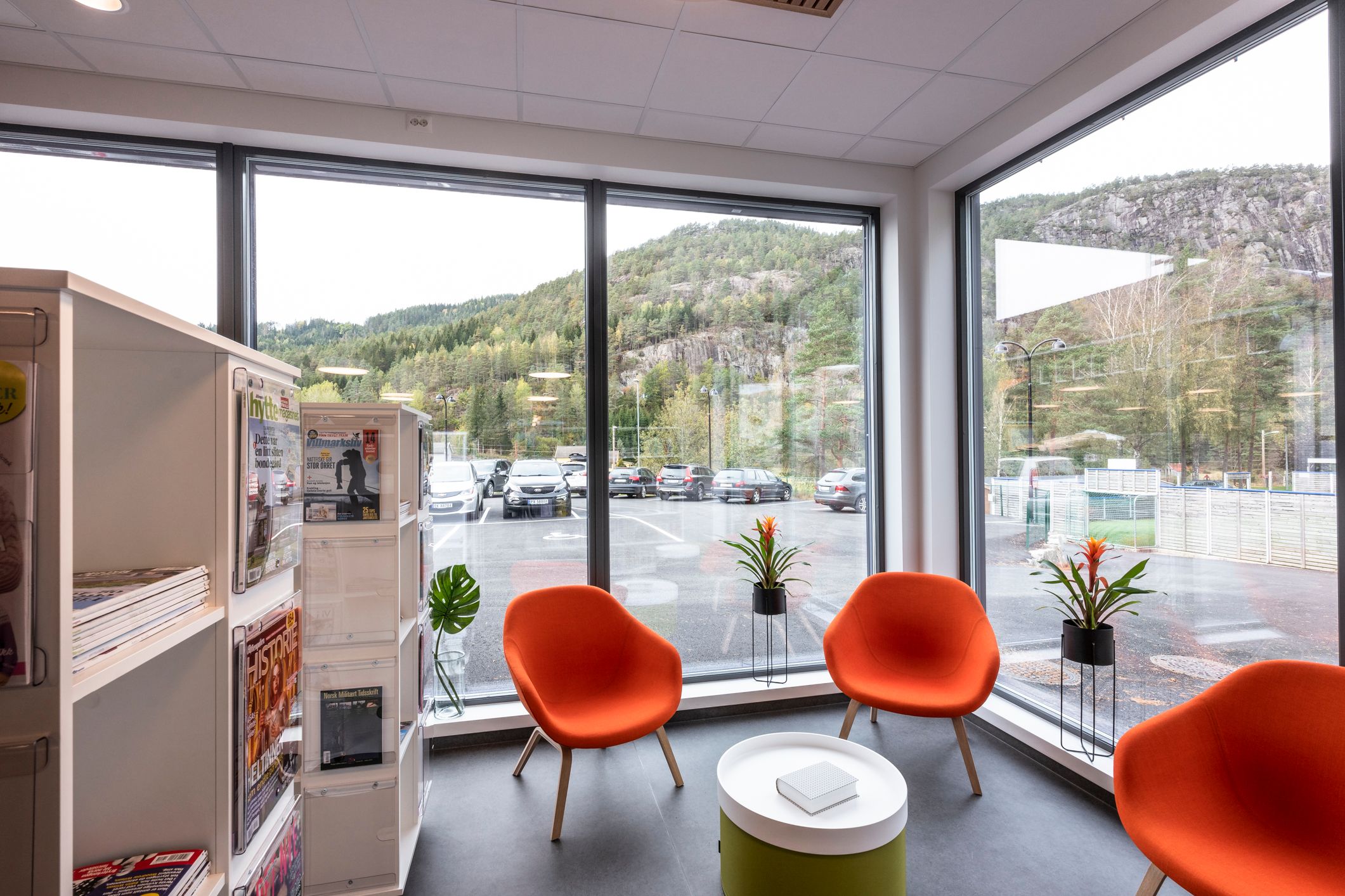 Og Innenfor døren fortsetter varme, oransje fargeklatter å si hei og velkommen til store og små: Fra den lave, vennlige skranken og videre innover i de lyse, åpne lokalene til soner for barn og yngre brukere, så vel som mer skjermede lesekroker for velvoksne besøkende med behov for ro og konsentrasjon.