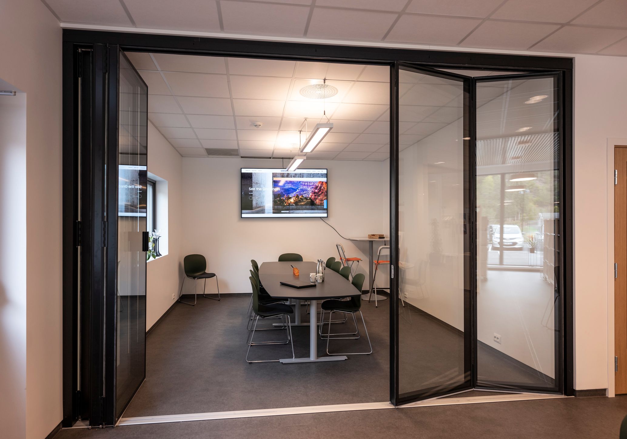 Et møterom som kan stenges av med glassvegg, byr på gode muligheter til aktiviteter i større grupper.