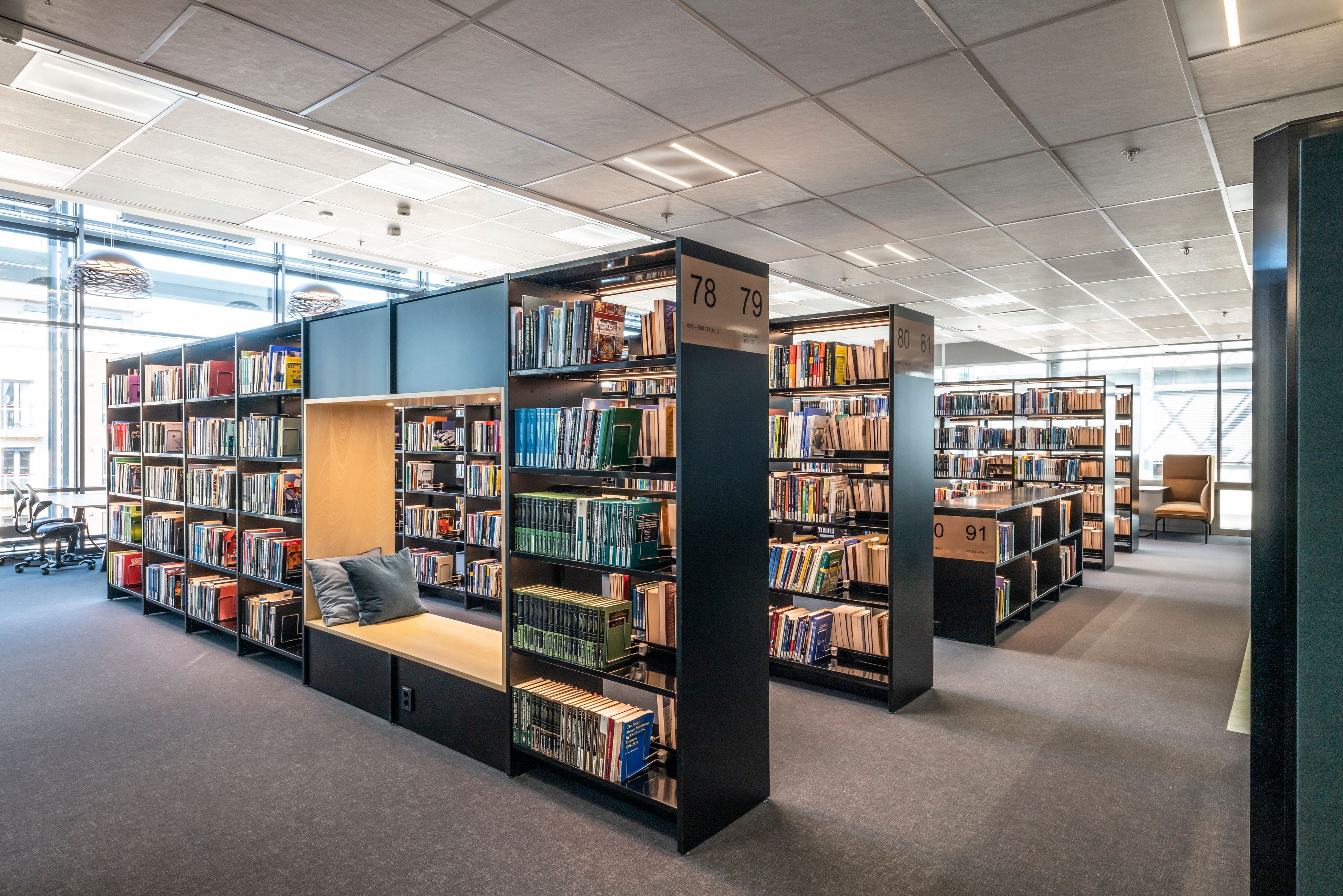 I dette prosjektet er det levert reoler type Lingo i sort farge A25 Jet black RAL 9005. Reolene er levert med lakkerte gavler i mdf uten synlige skruer på endegavlene samt med hyller i pulverlakkert stål. Det er valgt høyde 212 cm på de aller fleste reolseksjonene, men noen plasser finner man de lavere høydene 92 og 122 cm. Enkelte av disse lave reolene har fått en innramming i lys ask, spesialtilpasset på stedet.