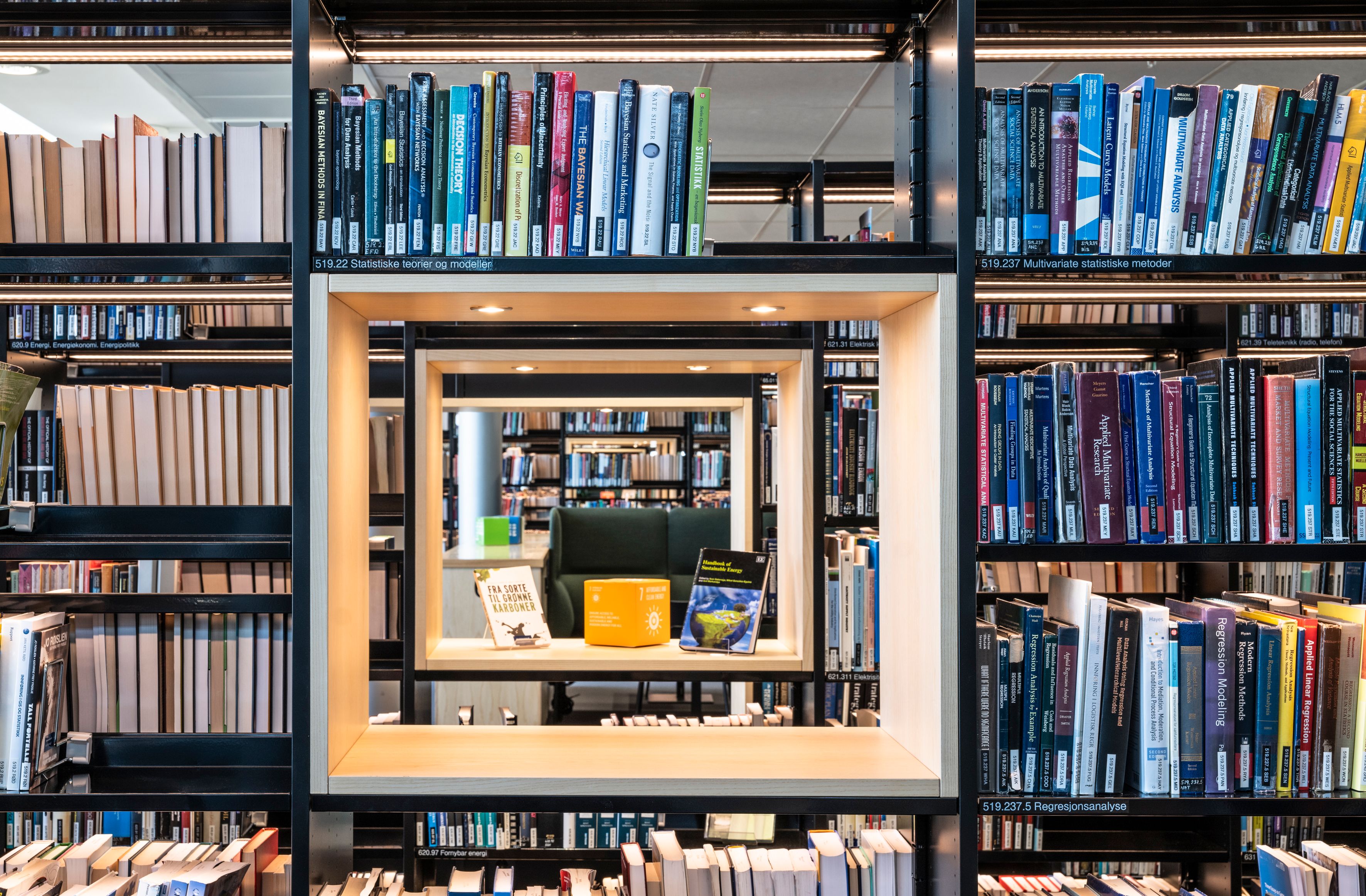 Reolene i høyde 212 cm har 5 hyller i høyden, mot normalt 6 hyller, for fint å kunne romme fagbøkenes ulike formater.