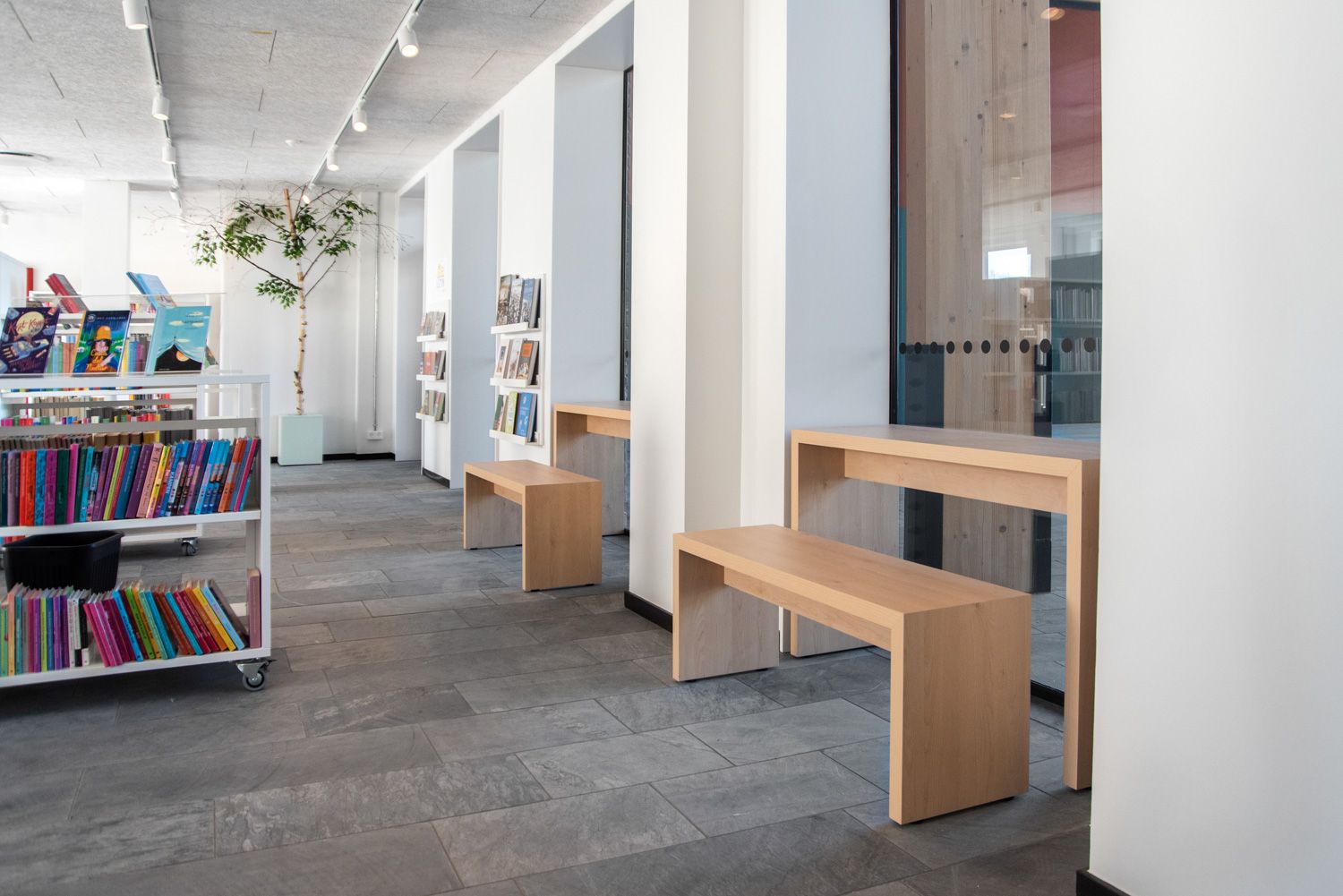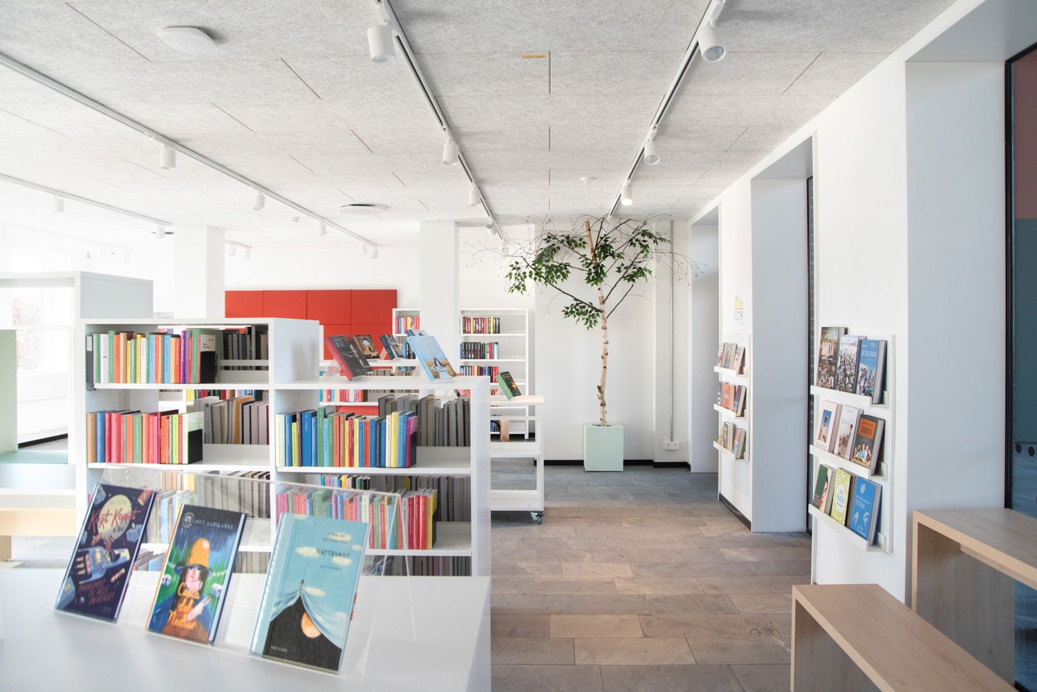 De brente og oransje fargene på utvalgte bibliotekmøbler, gir god kontrast til de mer naturlige nøytrale fargene og trematerialene, og flere steder i biblioteket bidrar Maria-podier til å skape fine utstillingsarealer og fremheve enkelte materialer.