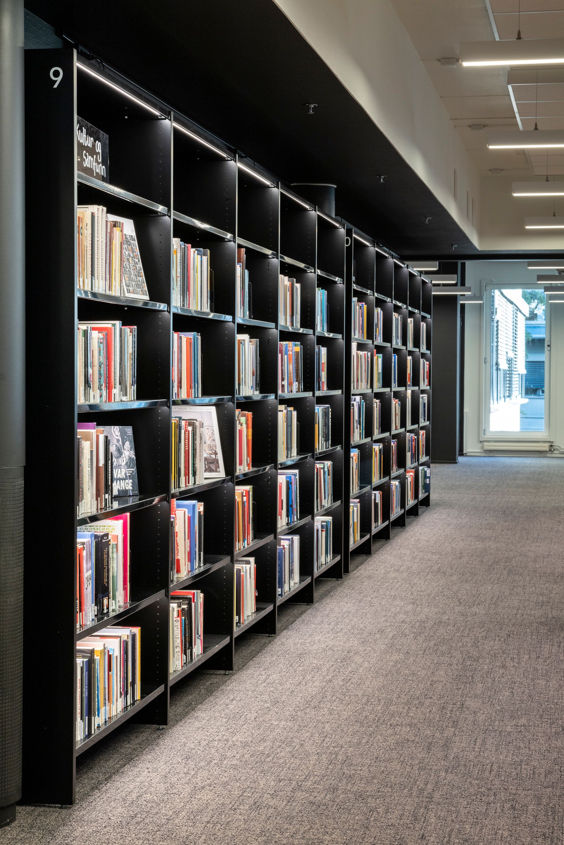 I dette prosjektet er det levert reoler type Lingo med gavler i mdf uten synlige skruer på endegavlene og med hyller i pulverlakkert stål. I første etasje er reolene levert med gavler i eik trefiner og hyller i stål farge sort A25 Jet Black RAL 9005. I andre etasje er reolene levert med lakkerte gavler og stålhyller, alt i farge sort A25 Jet Black RAL 9005. Alle bokhyllene har en integrert LED-lysstripe - noe som gir god lesbarhet, samt en 5 cm høy bakkant. Denne høye bakkanten gir god stabilitet til hyllen samtidig som den forhindrer at bøkene sklir bak.
