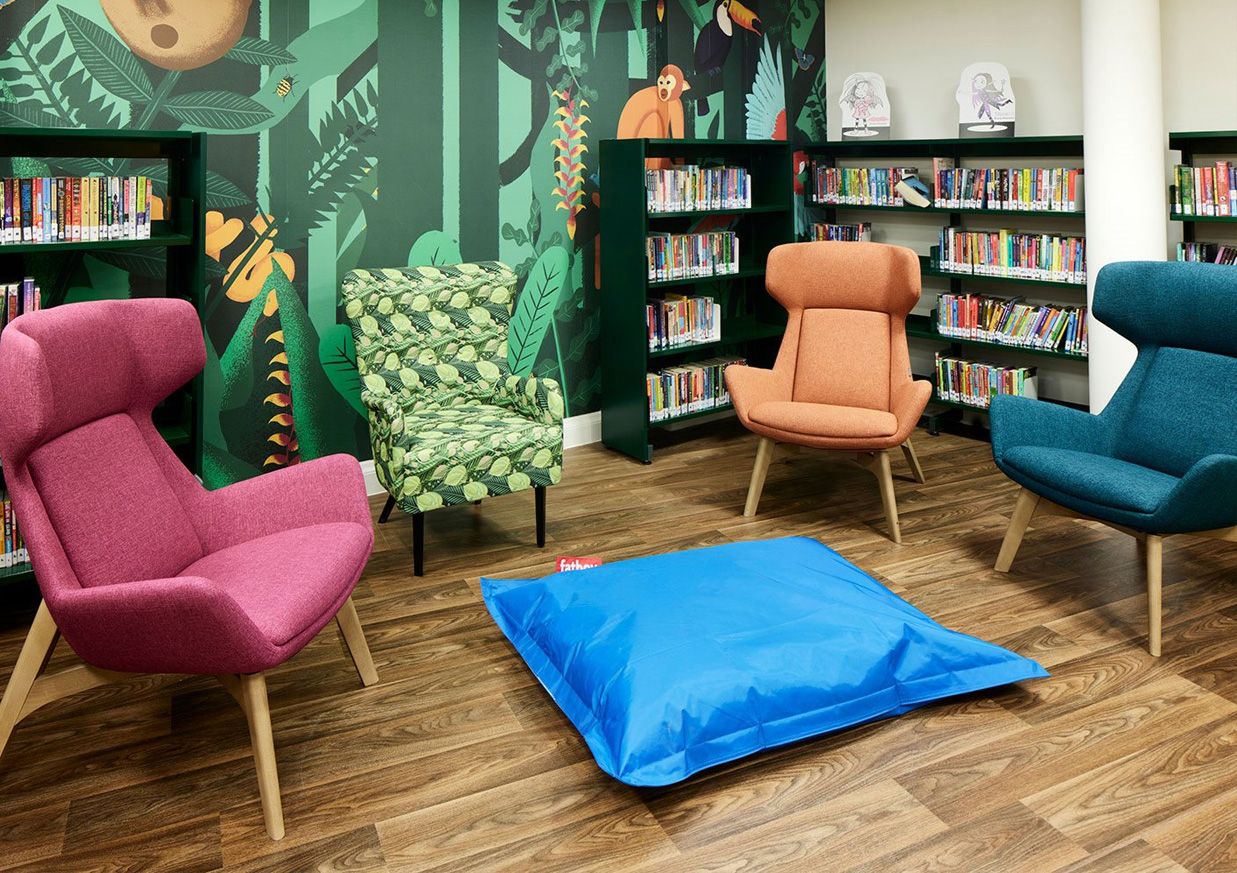 Bokreoler og studiebord i tre gir en vakker og varm kontrast til resten av bygningene på henholdsvis Wateringen bibliotek i Nederland og Esbjerg sykehus i Danmark, med tilknytning til friluftsliv. Rommene er opplyst av naturlig dagslys, mens grønne møbler støtter det biofile miljøet ytterligere.