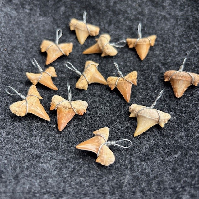 Fossile, ekte haitenner fra utdødde Otodus-haier som levde for ca. 60 millioner år siden. Det antas at Otodus-haiene kunne bli over 12 meter ut fra fossiler som er funnet. Disse haitennene kommer fra Marokko og leveres i papirpose. Vi tilbyr lærsnor med lås om deltakeren ikke har halskjede hjemme, se tilbehør under.