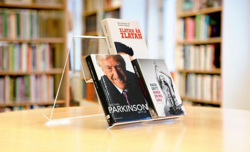 Skråhyller i akryl er en rimelig og lettvint måte å fronteksponere de fleste medier - noe som er viktig for å øke interessen og utlånet. Leveres i mange størrelser, varianter og farger og er anvendelig de fleste steder.